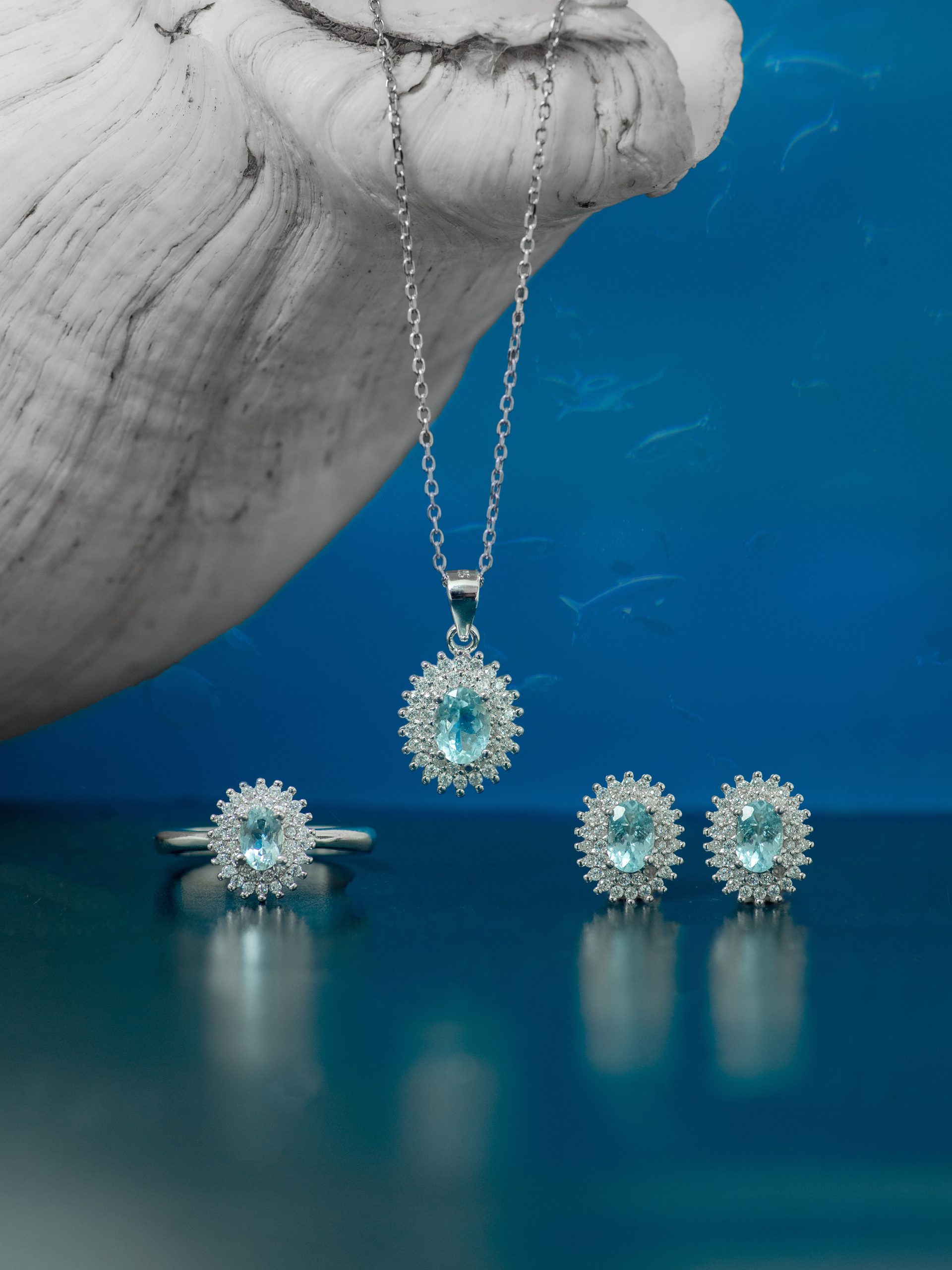 The Aqua Privé fullset features luminous aquamarine stones set in polished sterling silver — designed to evoke the serene glow of ocean waters and the refined energy of private coastal escapes. Minimal yet striking, this set is perfect for it-girls who appreciate understated elegance with a splash of ocean-inspired glamour.